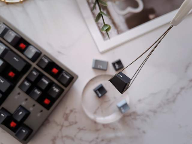 打开包装依次取出内装物品,发现除了键盘主体外,配件还有透明防尘罩、拔键器、理线魔术贴、说明书、A to C的连接线和C to C的连接线。同时还赠送了漂亮的杯垫。物料丰富精致,有种超值的感觉。