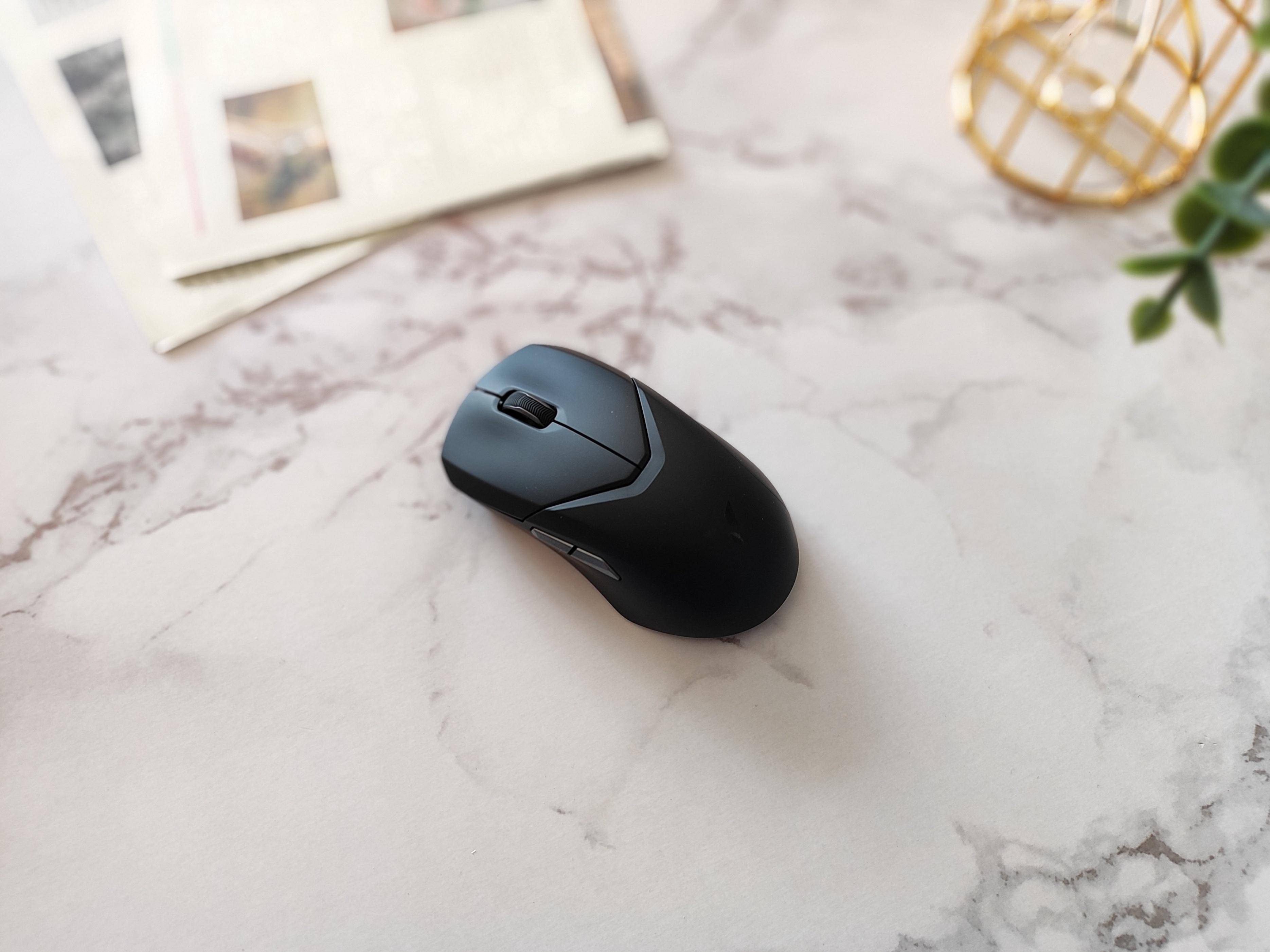 雷柏双模游戏鼠标VT9外形尺寸约为124.9*67.1*40.2mm,适合中大手使用,对我来说尺寸正适合。它采用左右对称分离式设计,五键布局,超跑流线造型,外覆类肤材质,触感舒适;它采用轻量化设计,纤薄ABS外壳,在没有洞洞的情况下,重量仅有78g左右。鼠标整体轻盈精致。