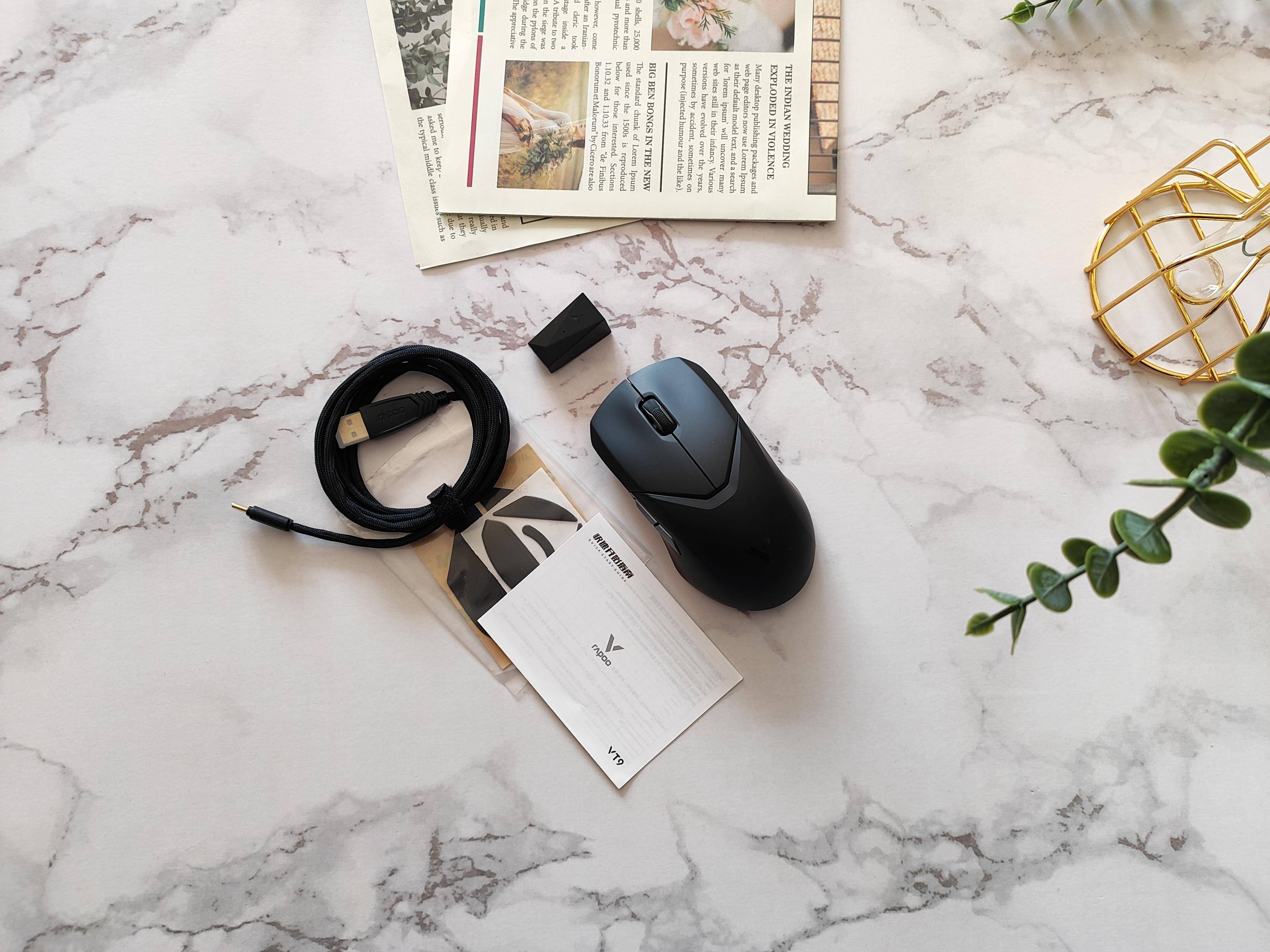 去掉包装,一起看下雷柏双模游戏鼠标VT9的物料清单,除了鼠标外,配件有备用脚贴/按键防滑贴、电源数据线、USB转接器和说明书。
