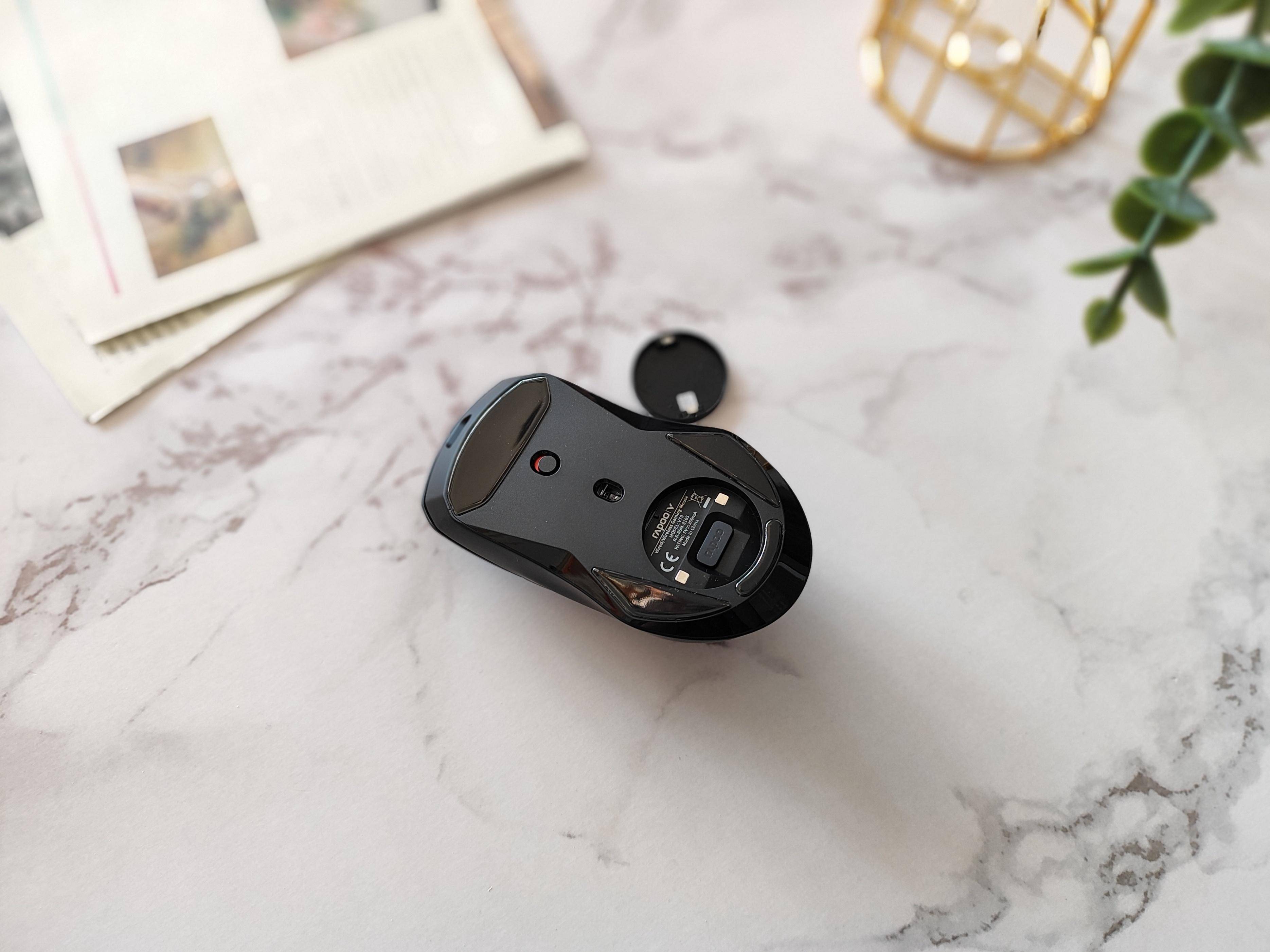 雷柏双模游戏鼠标VT9底面设计了隐藏式磁吸收纳仓,盖板下是2.4G接收器,放置/取出便利自如,携带方便,避免丢失。