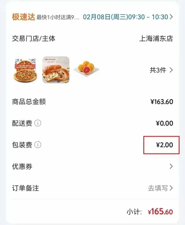 近日,上海松江消保委通过山姆APP下单极速达时,发现存在着包装收费标准不一且混乱的问题,原本1元的包装袋费用变成2元,也并未显示到关于包装袋涨价的通知。令人不解的是,虽然包装袋价格上涨,但包装袋并未升级,且加装冰袋的产品,也不是消费者认为需要加装的产品。