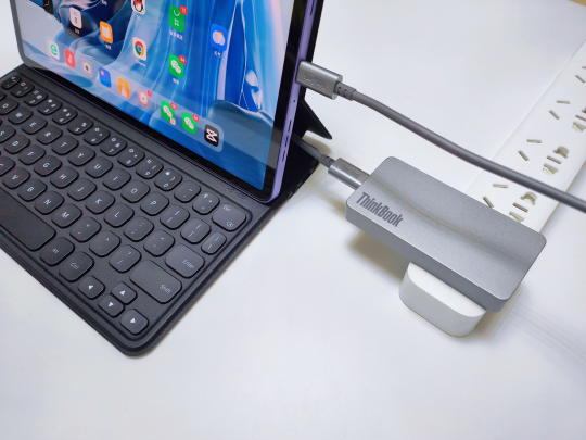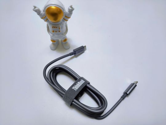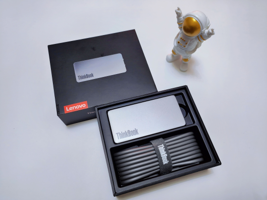 打开产品包装,虽还未取出适配器和数据线,但已经可以感受到联想大品牌的贴心设计,适配器表面覆盖一层保护膜,可以有效避免运输过程中磕碰损坏;数据线缠绕整齐,ThinkBook绑带可以保持日常使用的桌面整洁。