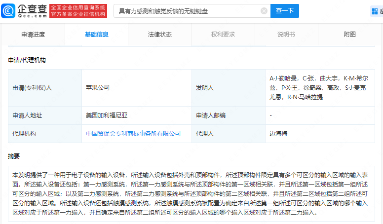 企查查APP显示,3月10日,苹果公司申请的“具有力感测和触觉反馈的无键键盘”专利获得授权。专利摘要显示,本发明提供了一种用于电子设备的输入设备,该设备包括外壳和顶部构件、第一力感测系统及第二力感测系统、触摸感测系统。其中,顶部构件限定具有多个可区分的输入区域的输入表面;第一、第二力感测系统分别与顶部构件的第一、第二区域关联,并且第一、第二区域分别包括第一组、第二组可区分的输入区域;触摸感测系统被配置为确定来自第一组或第二组可区分的输入区域的哪个输入区域对应于第一力输入或第二力输入。