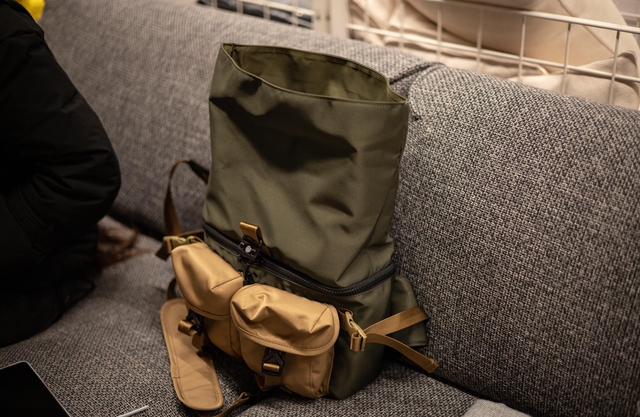 除了大前袋和机舱,洛斐相机包还有一个超级大的扩展空间,那就是它的卷边上盖。平时不使用的时候它通过磁吸式卡扣固定,需要的时候只要打开卡扣就会得到一个容量相当客观的扩展空间,现在出门气温变化大,热的时候就可以将外套放进来。