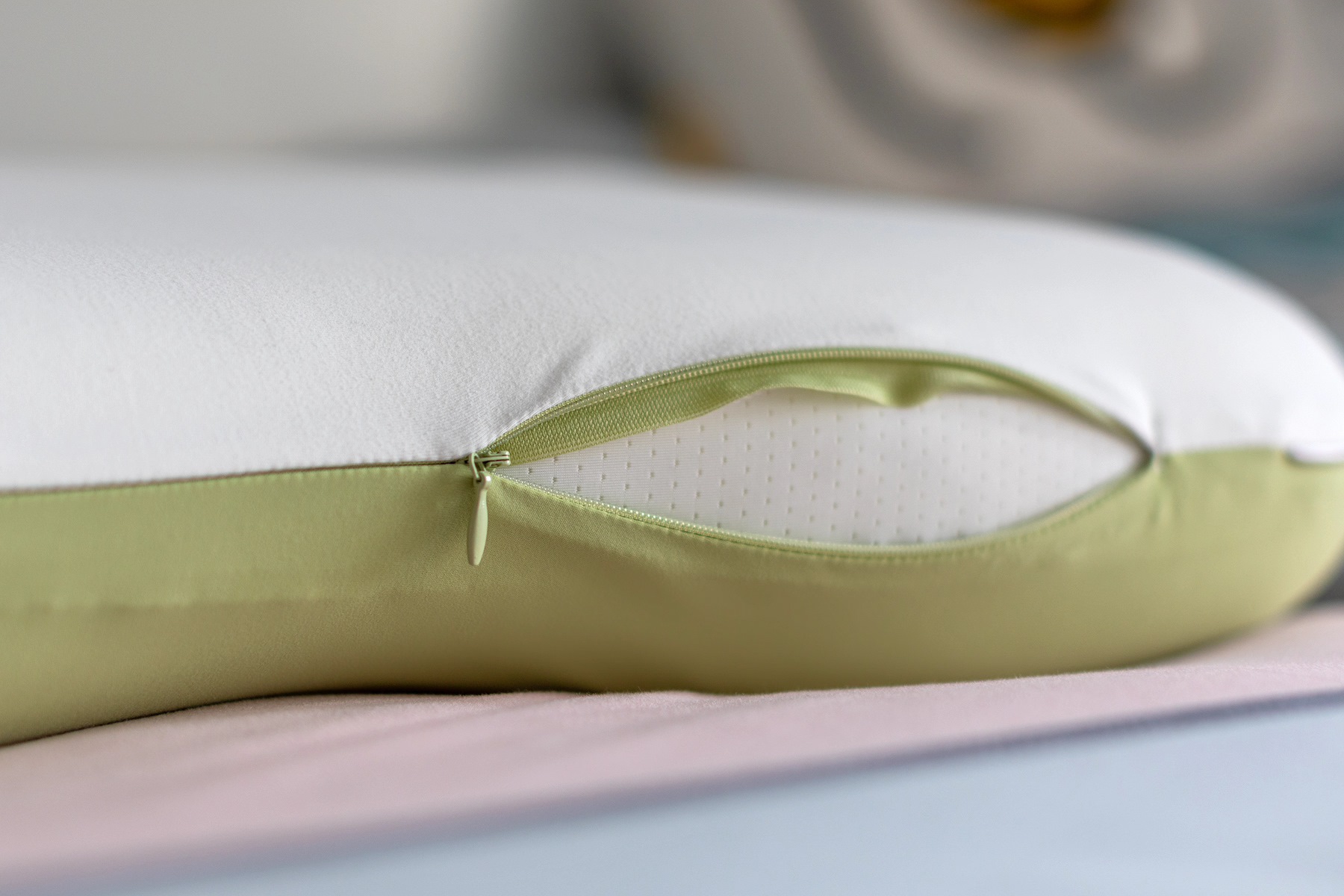 细节方面,时光存折草本枕的枕套采用了真丝滚边设计,隐藏式拉链将冷暖两块面料合二为一。左侧时光存折的小布条LOGO还可以做为提手使用,在清洗枕套时也可以作为凉挂使用。