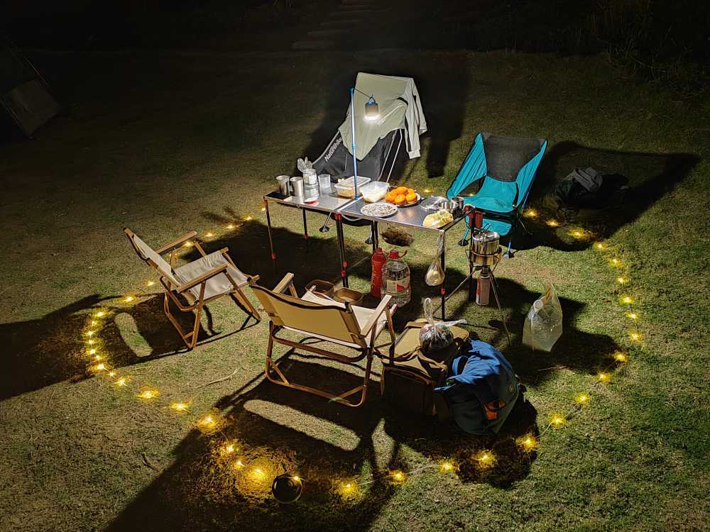 有了灯串,氛围感就上来了,我们可以用来圈地围栏,也可以挂于帐篷、天幕上面,或者风绳上作为警示作用。