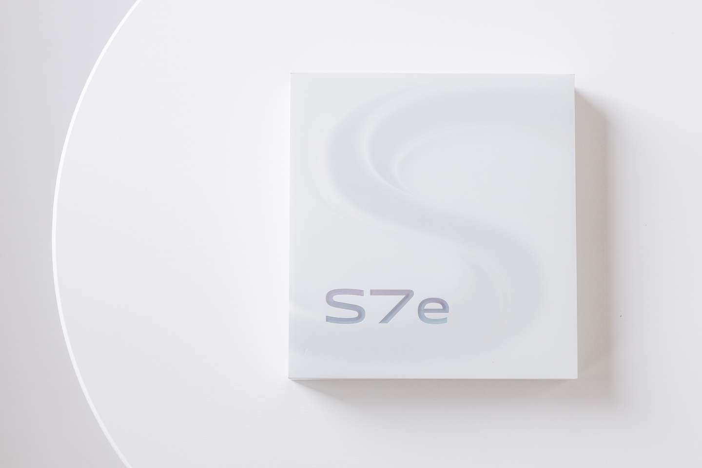 最惊喜的是盒子的正面,首先烫金的S7e烫金字母,在不同角度下折射出不同的颜色。而整体上,这并不属于典型的极简设计,在放置在左下角的S7e文字背后大片留白中有一个巨大的、若隐若现的巨大S型反光涂层,在不同角度下折射营造出一种立体的S效果,这个应该是代表S系列机型。整个盒子的设计可谓是简约大气,个人非常喜欢。