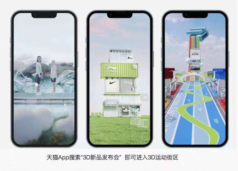 3月31日,手机天猫App上线3D运动街区,NIKE、HOKA、索康尼、李宁、安踏、特步6大运动品牌,在3D空间举办跑鞋新品发布会,首发春季新品。
