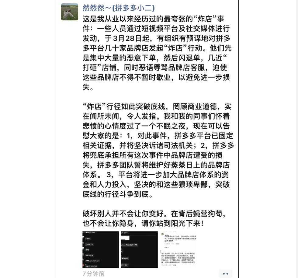 这两天,有拼多多小二在网上发布了消息,称店铺受到了数万条恶意订单,很明显是有组织有预谋的。并且,这位店小二还表示这是“从业以来经历过的最夸张的‘炸店’事件”。从3月28日开始,一些身份不明的人员通过短视频平台以及其他社交媒体进行发动,对拼多多平台的几十家品牌店发起了“炸店”行动,造成了极为恶劣的影响。