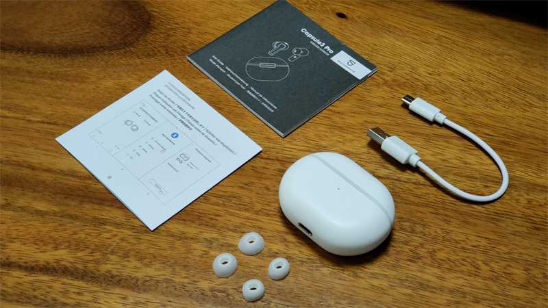作为主流的TWS耳机,在配件上与同期的其它产品差不多,一份多国语言的说明、APP操作指南、usb-c充电线、耳机移动充电收纳盒、备用的大、小两副耳帽。
