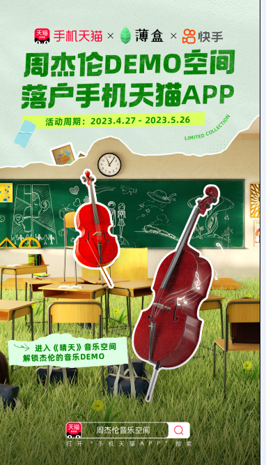继3D音乐节、艺术展之后,手机天猫3D场景再上新。4月27日,薄盒App与手机天猫、快手联合推出“周杰伦限定珍藏DEMO空间”手机天猫3D版。去年,杰威尔音乐唯一授权薄盒App推出“周杰伦限定珍藏DEMO空间”,由周杰伦挑选的5首未曝光的DEMO组成,包含“青花瓷”、 “晴天”、 “搁浅”、 “爱在公元前”、“纽约地铁” 。