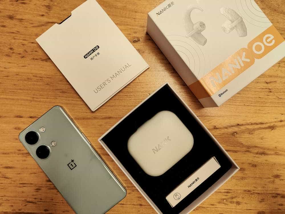 上一张全家福,分别是南卡OE耳机一对、电池仓一个、外置犀牛角一对、Type-C充电线一条、用户手册一份。
