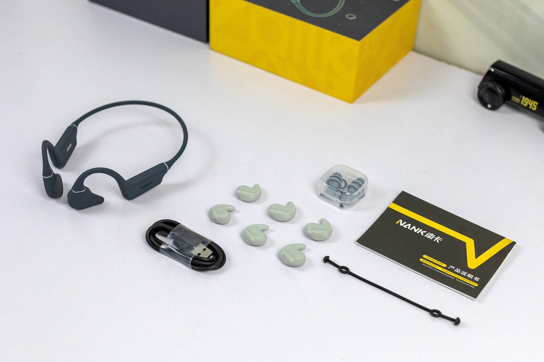 打开包装,除了耳机和充电线外,南卡Runner Pro 4S还配送了3对音质增强器、1对耳塞、1对麦克风防水塞和1个松紧调节器及产品使用说明书,这就是南卡Runner Pro 4S的全家福了。