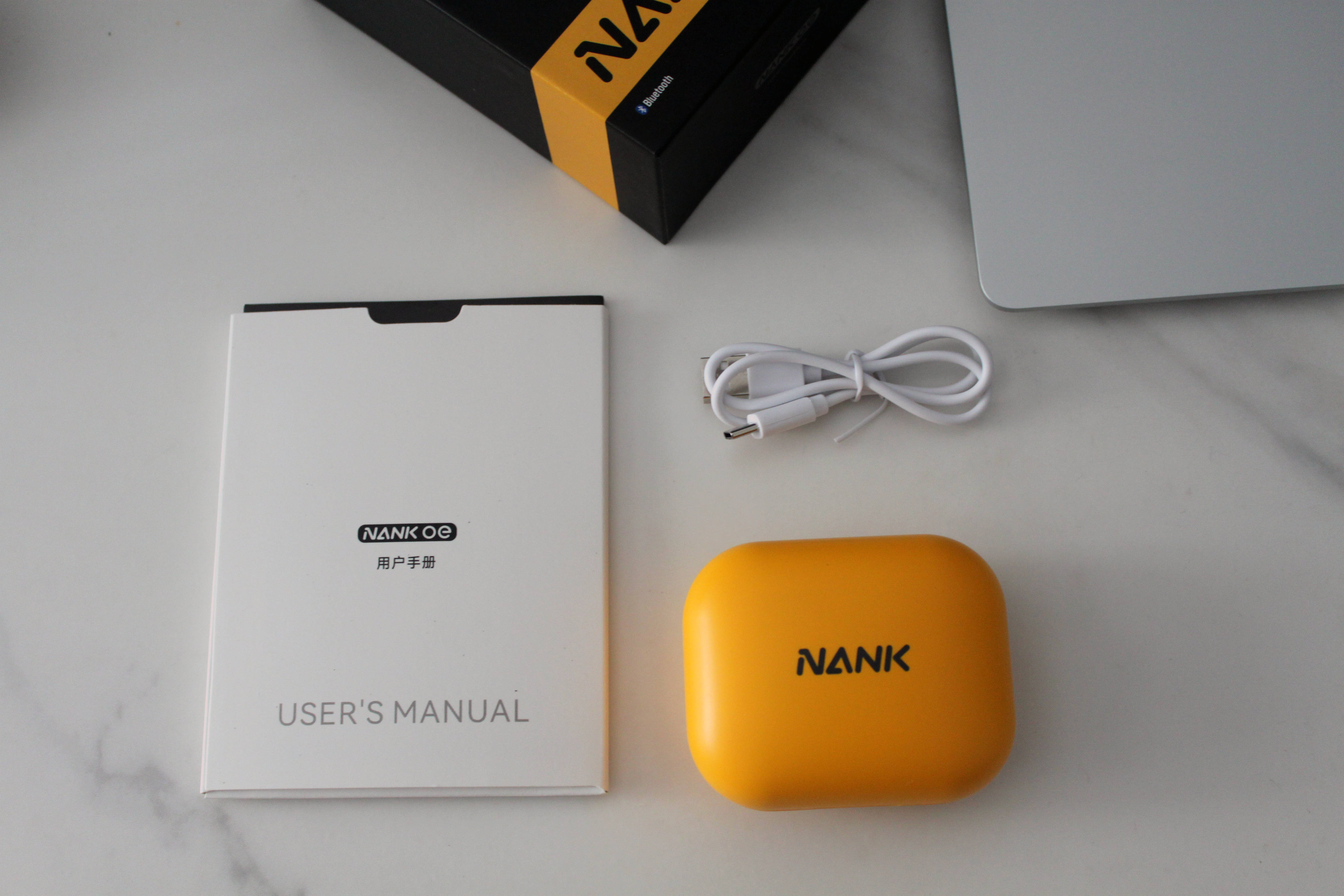 打开包装盒后,可以看到南卡真无线骨传导耳机OE搭配了含耳机的充电舱一台、type-C的充电线一条和用户手册一套。