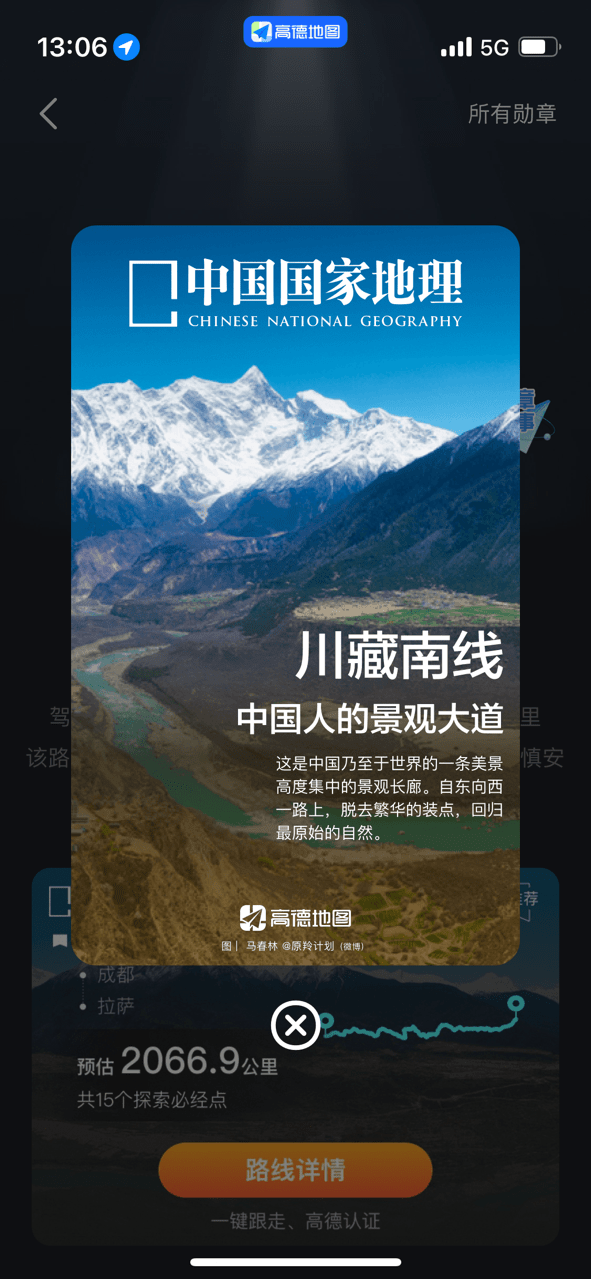 而针对实际前往的用户,《中国国家地理》和高德地图也将共同颁发对应路线的“实走认证”高德虚拟勋章(部分用户还有机会获得精美实体勋章车贴),并且后续在APP内可随时查看各自的自驾游“人生探索”路线。