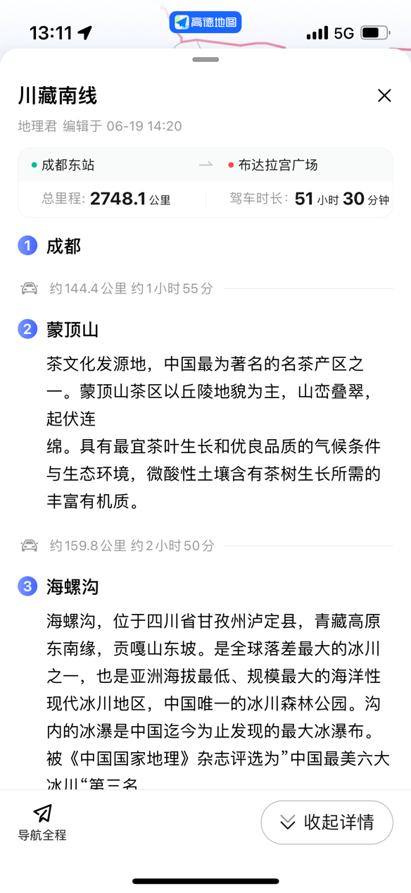 进一步点击页面中的“路线详情”后,用户则可以查看该自驾路线的途径点,以及所对应的详细介绍,以便根据自身实际情况和喜好,选择停车和游玩节点。