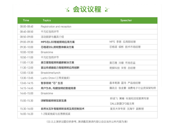 会议将会从早上8点开始持续到下午16:20,第一位演讲者芯源系统股份有限公司(MPS)应用部经理李恩将在9点开始演讲《MPS在LED智能照明应用方案》。