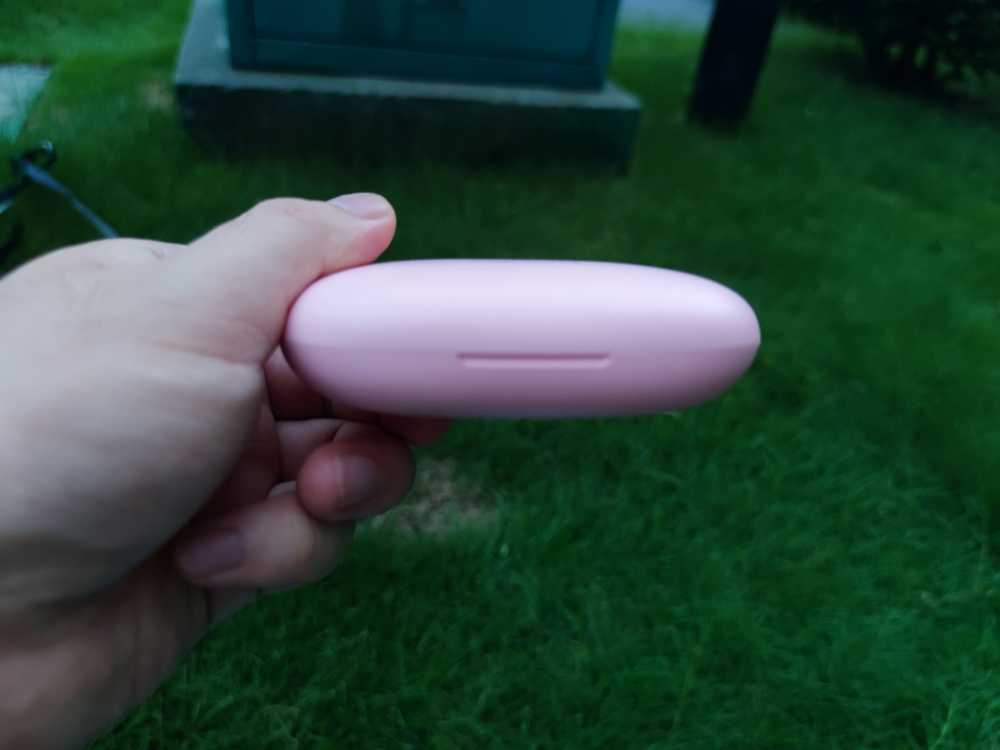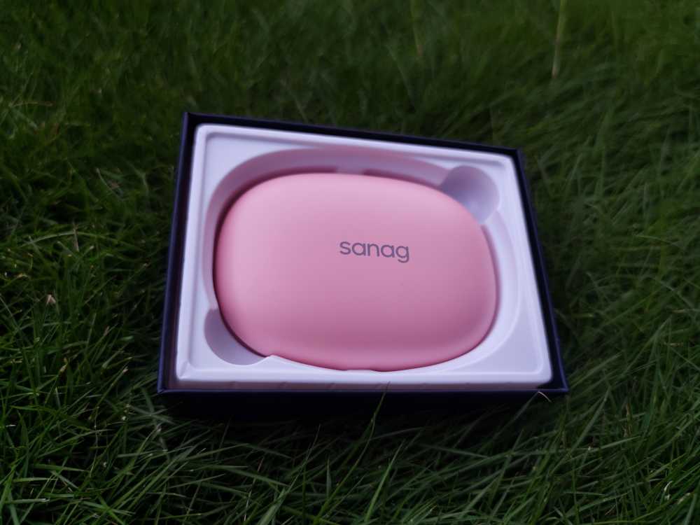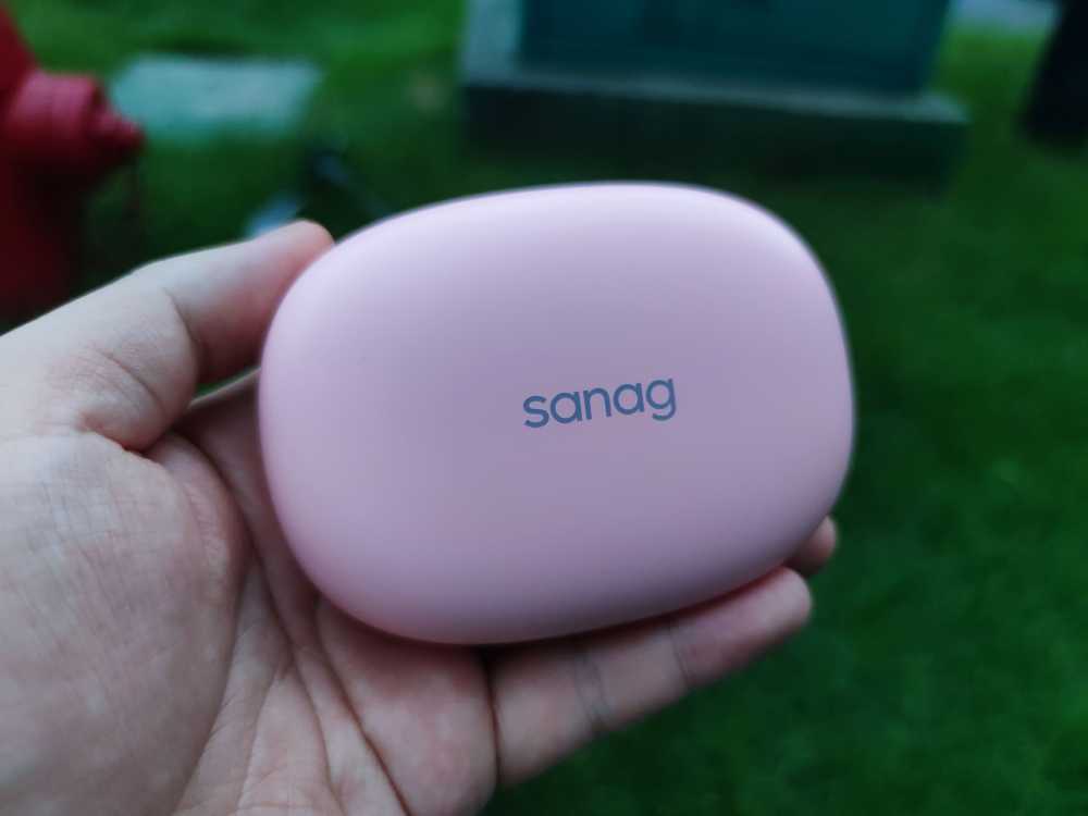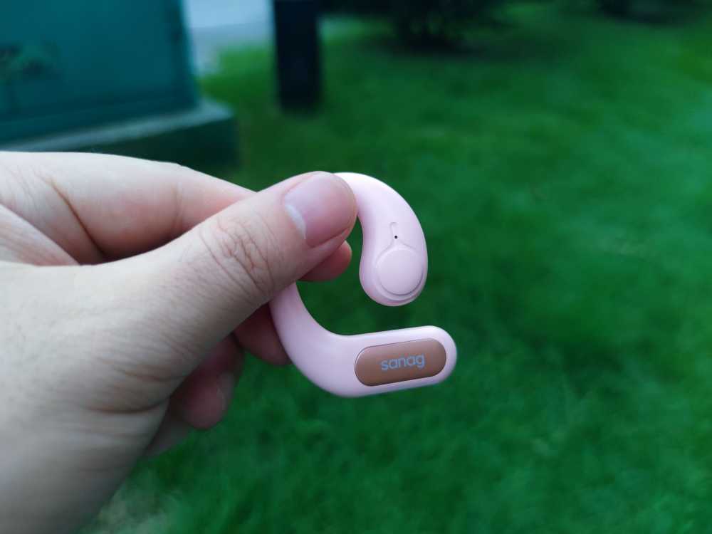 打开包装,先是看到一张VIP卡和抽奖券,之后是粉色的耳机盒,看来确实没发错配色。不过,耳机盒的大小还是超出了我的预料,不知道的还以为是个充电宝呢。耳机盒采用了类似鹅暖石的扁平设计,虽然略大,但是不占空间,可以方便装进口袋。打开盒子,就看到耳机真容了。第一次见到这这特别设计的耳机,正面是sanag品牌logo,整体设计有点像挂钩,它是要挂在耳廓上使用的。从设计上来说,的确是独具一格。