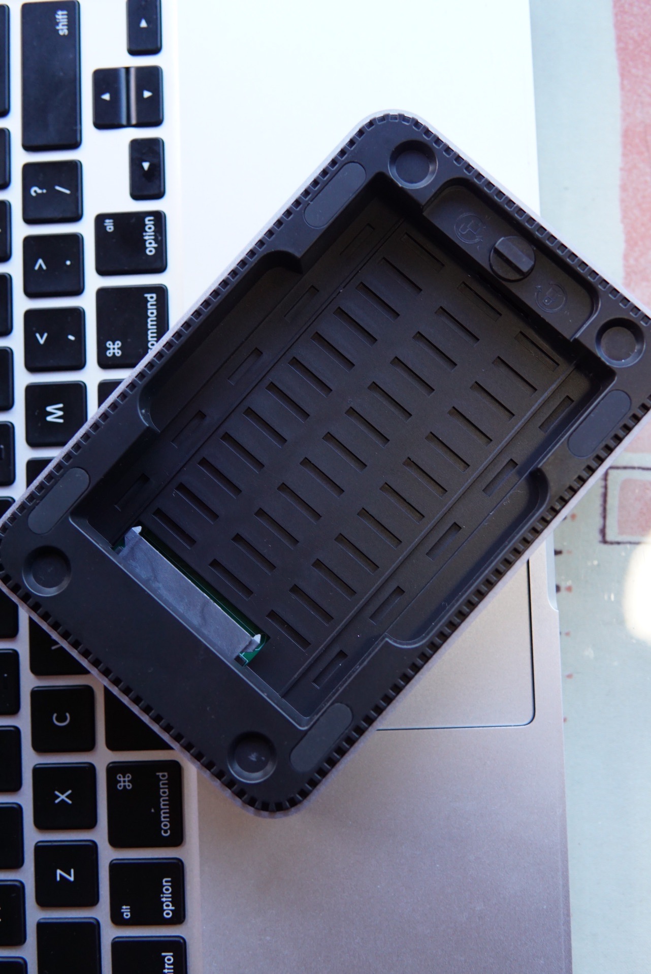 硬盘盒做工非常的别致,也是算是别出心裁,盒子上盖是用磁吸方式,这样你硬盘拿进拿出也不用螺丝刀和工具,也会非常的方便,适合需要折腾的人。当然,这里个人建议还是采用一颗螺丝或者是旋转锁定的方式来锁定外盖,这样对里面的硬盘更加安全。因为硬盘盒万一也有可能 脱离地心引力起飞的时候。