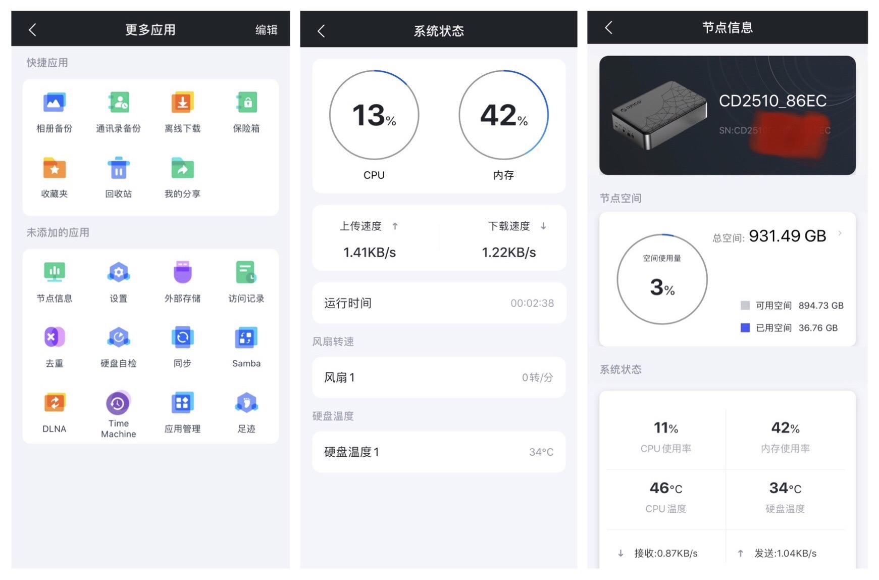 应用里面的去重功能也是非常的实用,可以检测重复的照片或者资料加以删除。节点信息可以看到硬盘的使用空间还有多少,上传下载的速度以及设备运行时候的 CPU和硬盘的温度。