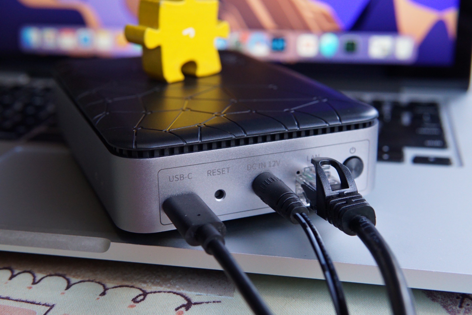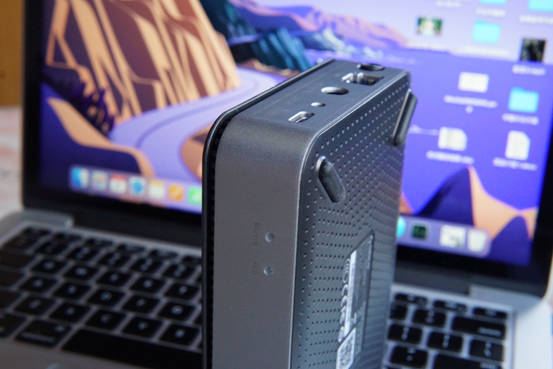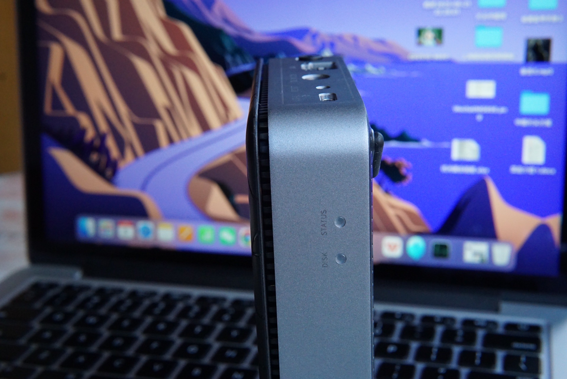 侧面的两个指示灯,一个是硬盘盒网络工作状态,一个是硬盘的工作状态指示灯,这样万一有硬盘或者网络问题,都可以通过灯光来大致判断。铝合金的中框对散热也有一些好处,也提高了整机的坚固性和高级的高级感。