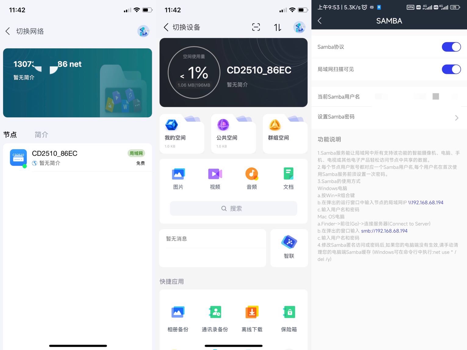 输入手机码,收到验证码以后可以点击确认,然后就可以看到设备CD2510,里面分成三大块,我的空间,公共空间,另外一个是组群空间。上传图片速度也是非常的快当然这个是根据你的网速来的,基本上可以拉满,上传的图片视频和文件资料你有两种方式来看,一种是以照片视频或者是文件形式快速预览和查找,另一种是以文件夹的形式来翻阅,这个就看个人喜好。