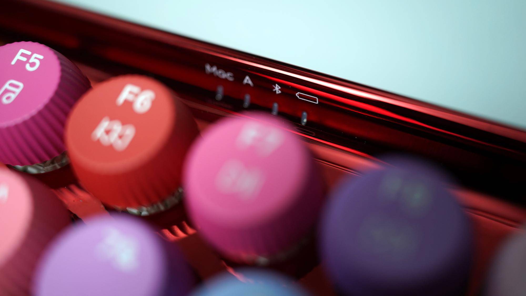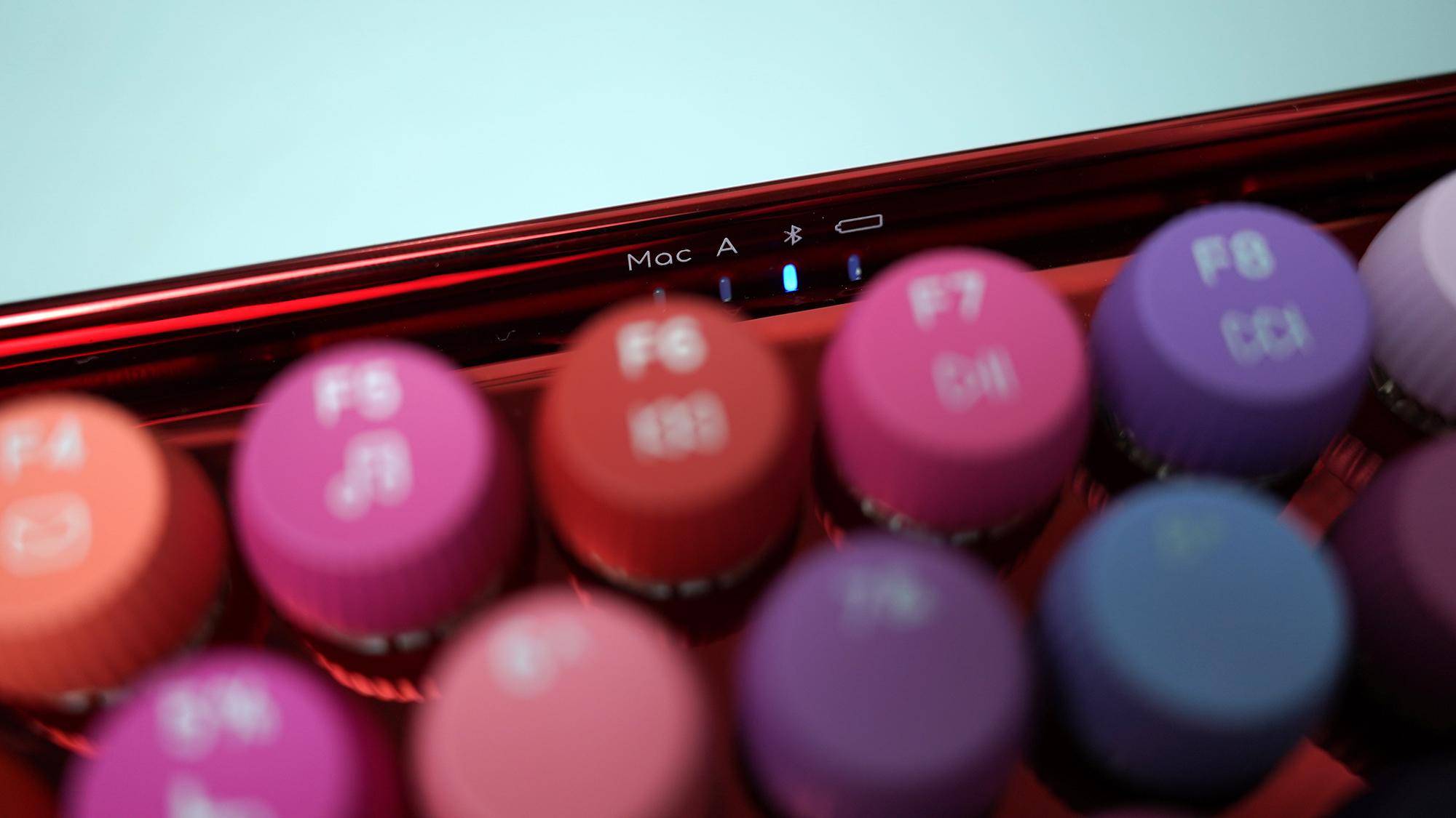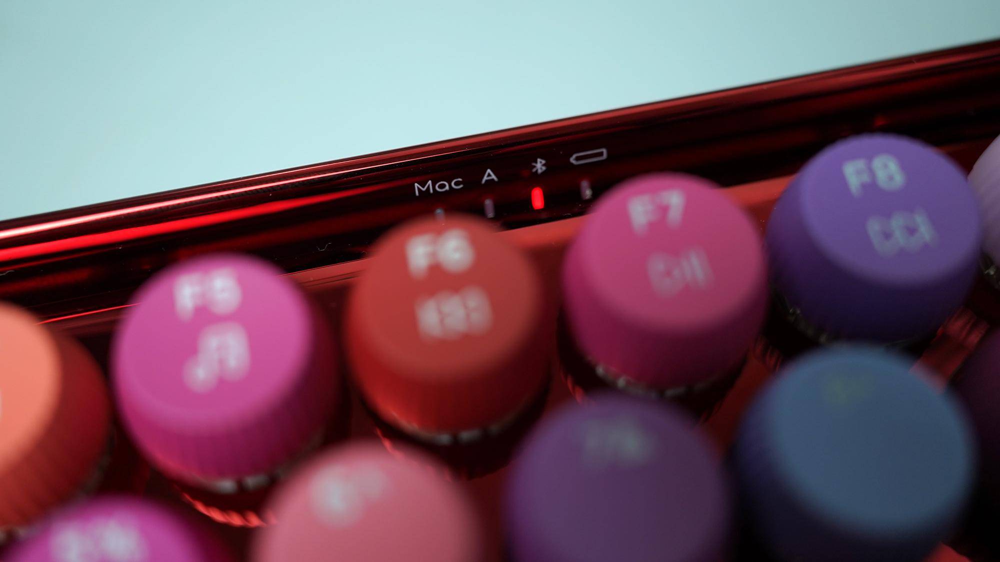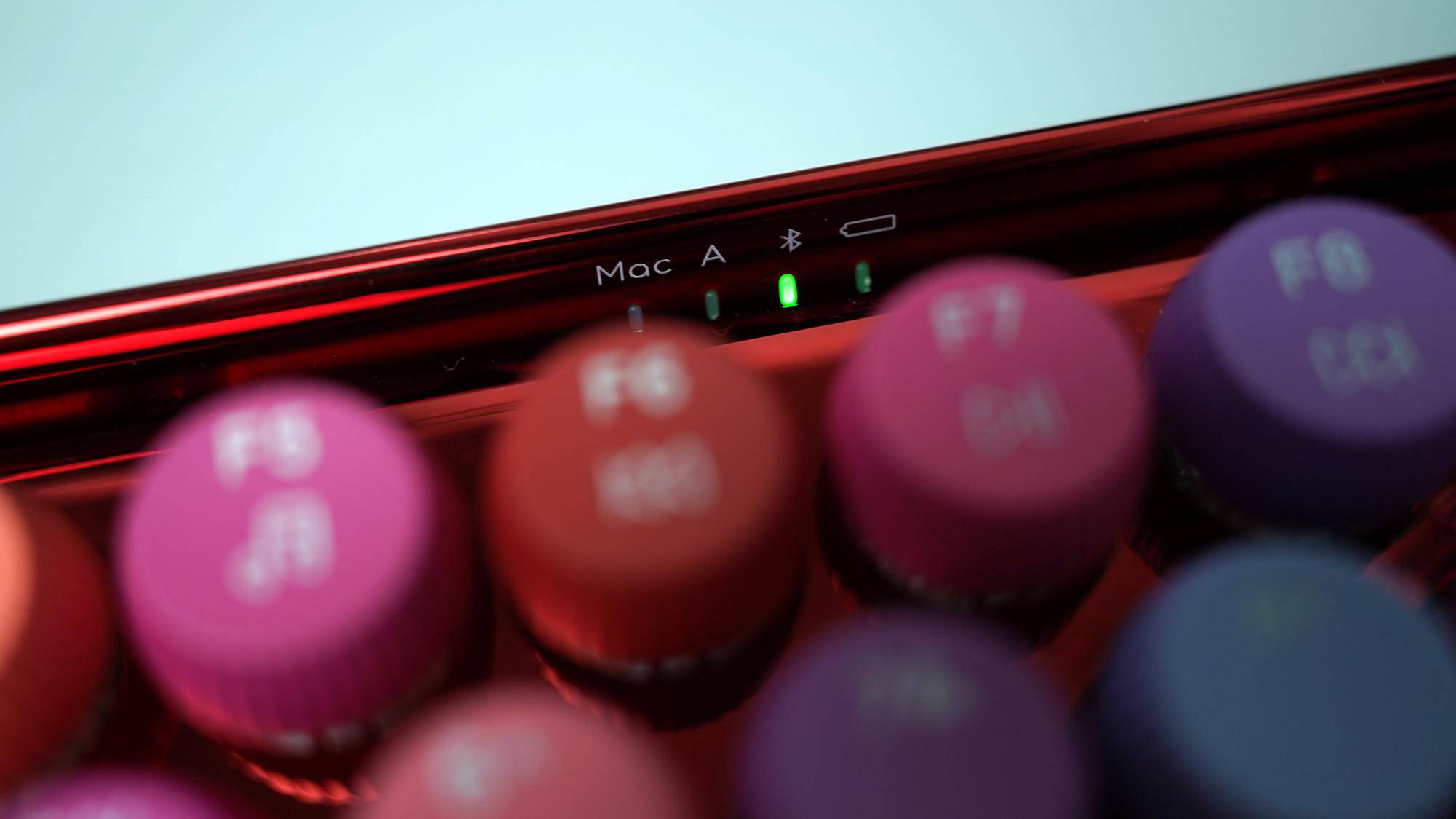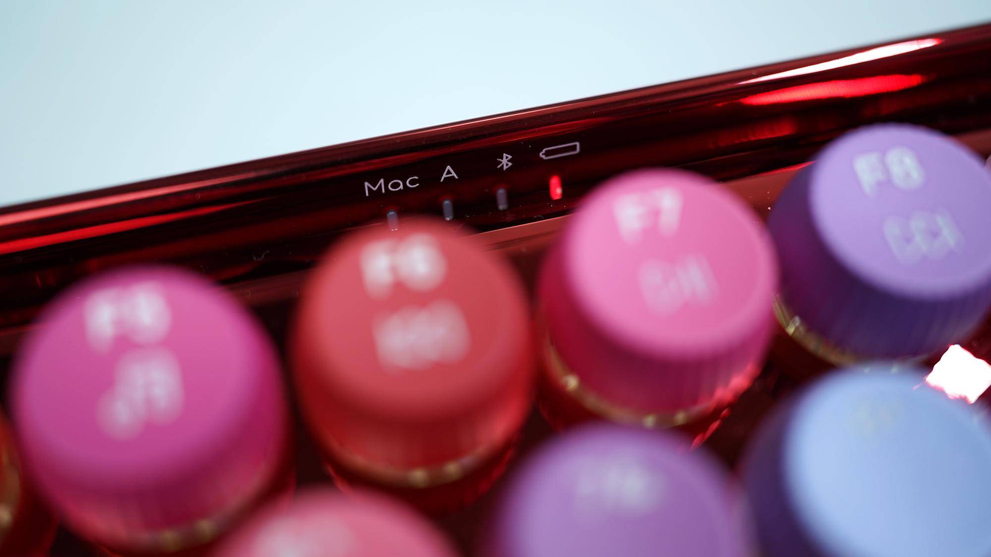 不同于其他普通设计的键盘,雷柏ralemo Pre 5彩妆版的指示灯设计在了键盘的中间位置,其中的蓝牙指示灯的亮光类型对应不同的连接设备:
