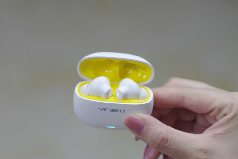 耳机的充电仓扁圆形,非常小巧,手摸上上去有磨砂质感。开仓仓内壁鹅蛋黄配色,将两个耳机包裹其中,打开半仓盖,两个白色耳机冒出头,酷似两只小白鹅出入人世娇羞的探头探脑状,很是惹人喜爱。