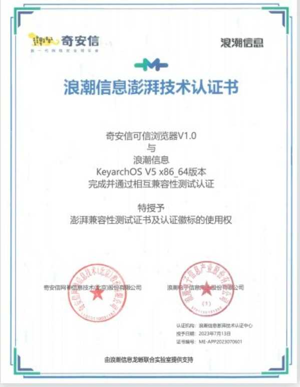 北京2023年7月27日 /美通社/ -- 近日,奇安信可信浏览器V1.0与浪潮信息云峦操作系统KeyarchOS V5完成并通过了兼容性适配认证。经双方联合测试,二者完全兼容,功能、性能和兼容性方面表现良好,运行稳定高效,满足用户需求。