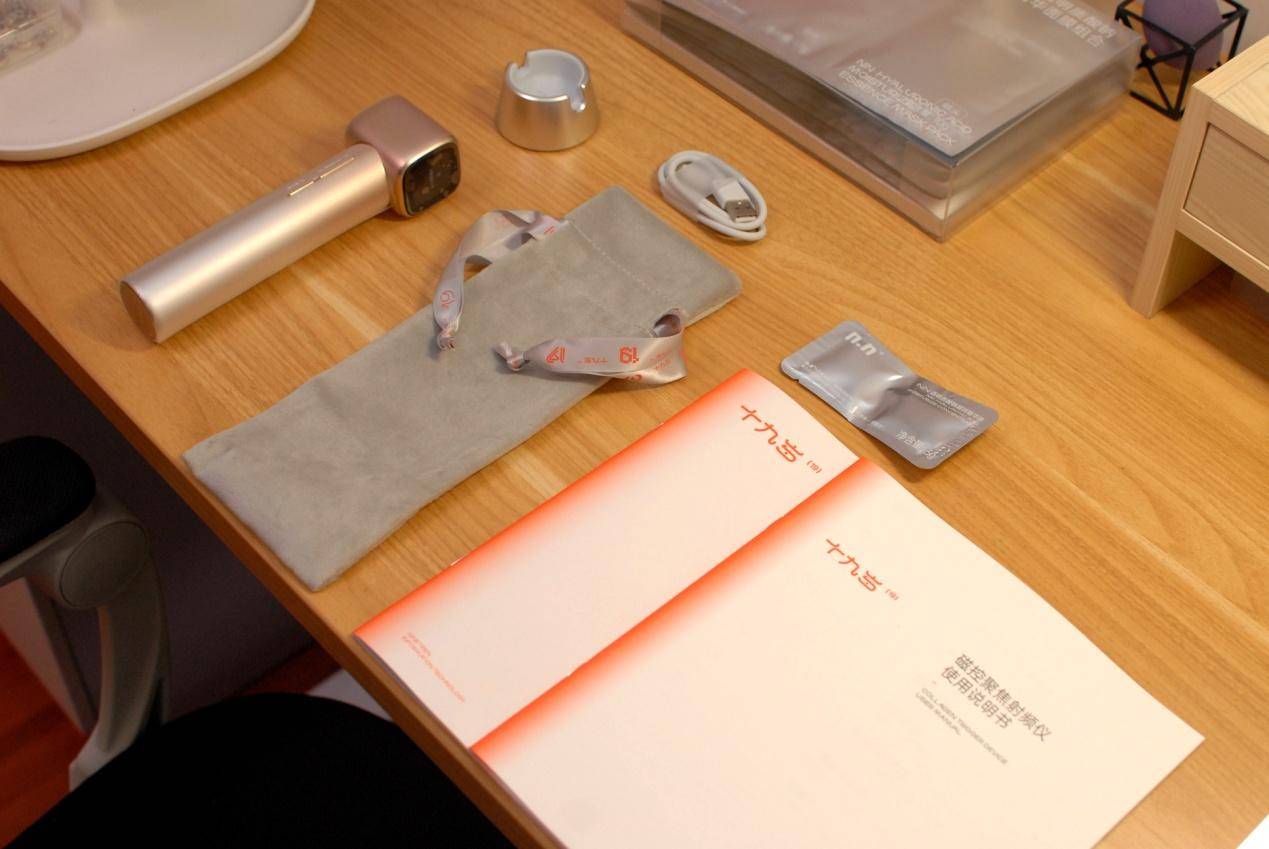 包装内的其他物件展示,除了十九岁美容仪之外,分别还是磁吸底座、Type-C充电线、一包NN透明质酸钠凝润精华液和收纳袋。