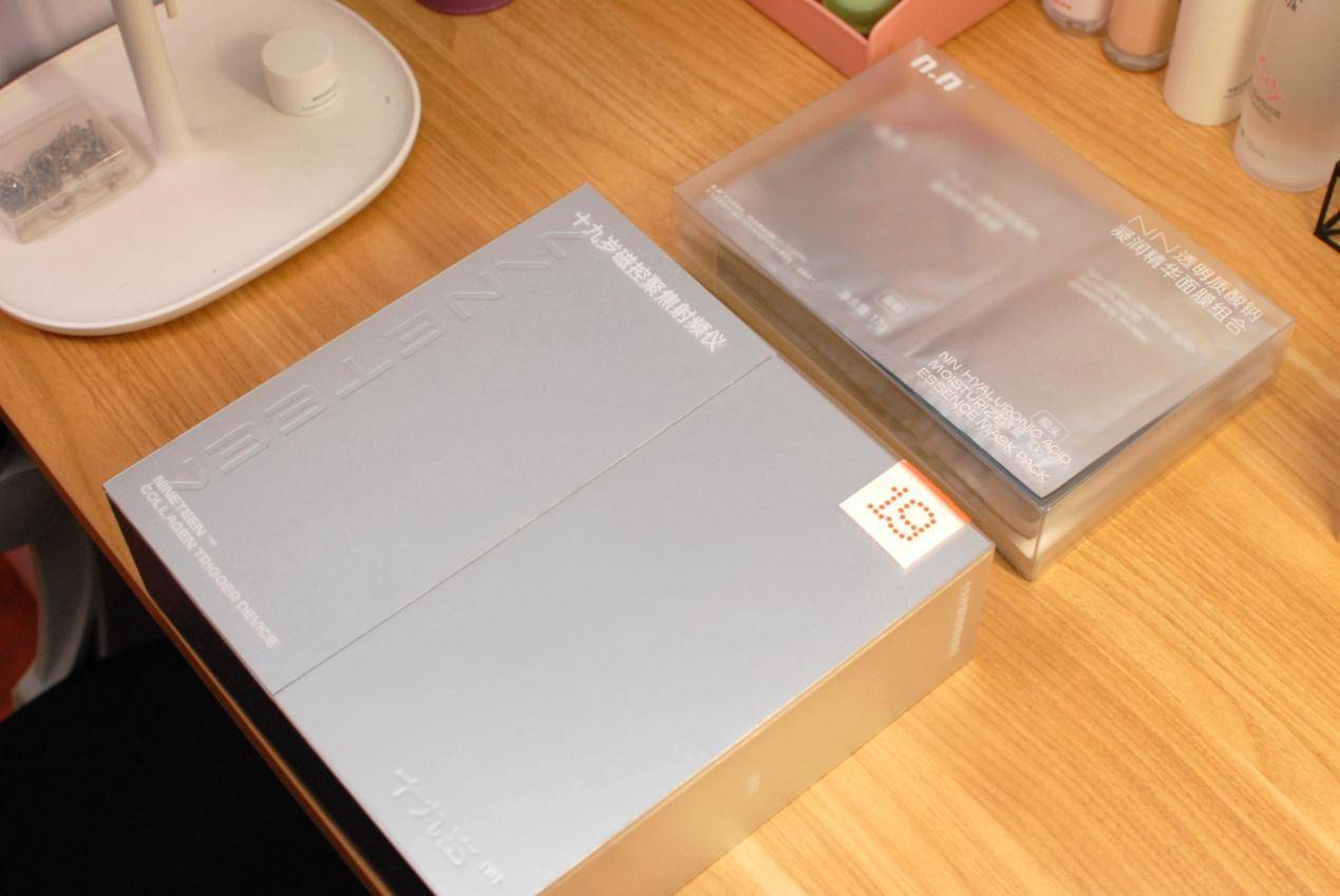 既然是说体验,当然也少不了开箱环节,我们先来看看入手的这套美容仪都有些什么?大盒包装就是十九岁美容仪,其实这款产品的全称叫做十九岁胶原锤射频美容仪,为了方便大家记住产品,下面我们还是简称十九岁美容仪好了。另外,小盒包装的是配合美容仪使用的NN透明质酸钠凝润精华面膜组合,众所周知想要美面膜当然少不了,所以你懂的。