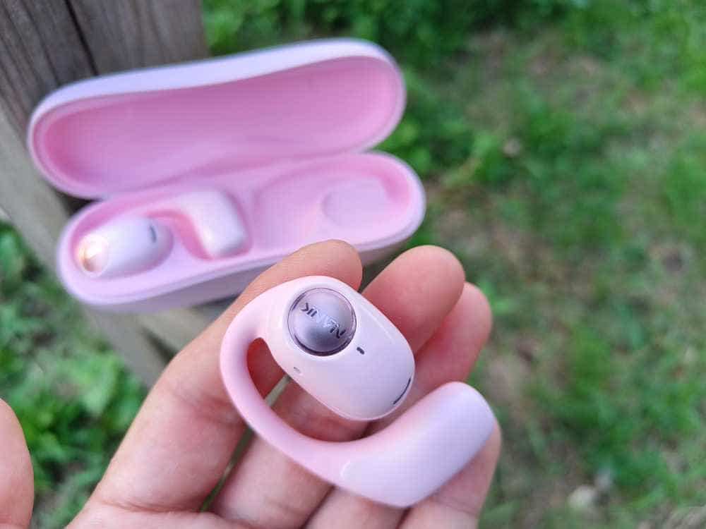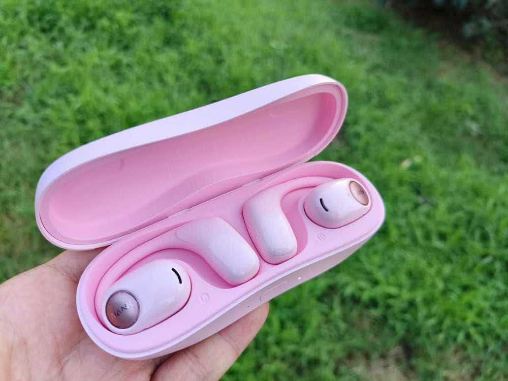 首先,从外观设计上来看,南卡蓝牙耳机OE Pro采用了简约时尚的设计风格,淡粉色的外壳搭配银色的logo,给人一种小清新的感觉,0感的佩戴方式能够满足不同玩家的需求。