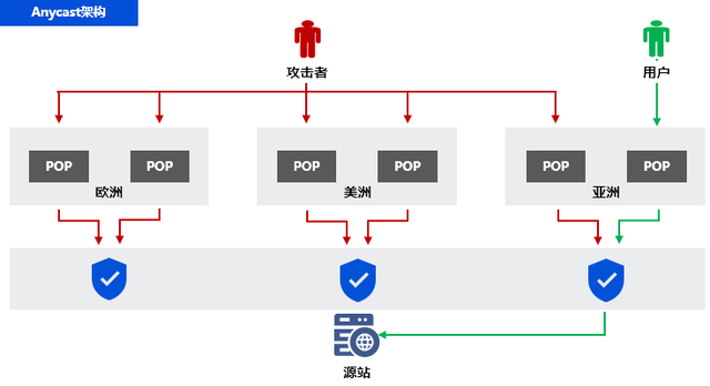 腾讯云边缘安全架构采用“近源检测、近源引流、近源防护”原则,通过Anycast路由策略,就近疏导攻击流量至最近节点防护处理,从而将攻击分散至全网数十个PoP节点,从而降低单节点压力,保障业务高可用。而面对全球攻击源分布并不均匀,根据腾讯安全检测,主要分布区域包括北美、东亚、欧洲、南美等区域,边缘安全架构在上述区域设置T级清洗中心,以缓解上述区域攻击流量,同时PoP接入顶级Tier1运营商,满足正常业务网络质量要求。