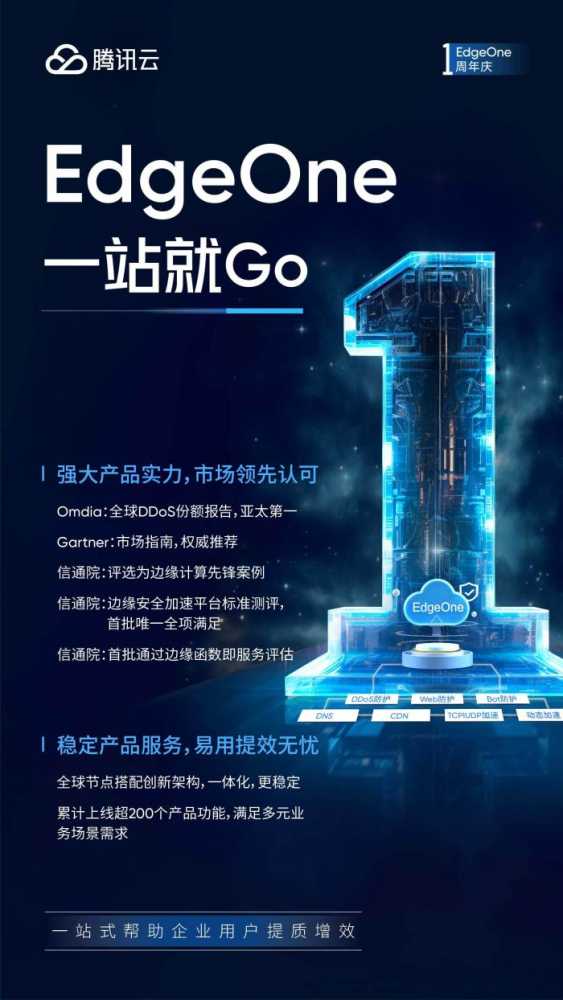 洞察到这一趋势,2022年7月29日,腾讯云面向全球市场正式推出了边缘安全加速平台——EdgeOne,这是国内市场上首款真正意义上的一站式边缘安全加速产品,旨在为企业提供更安全更低时延的一站式接入服务,助力数字化转型和业务快速增长。