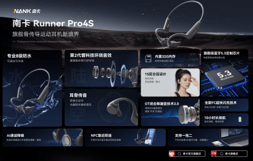南卡多年对产品的极致追求,培育出多款爆款产品,Runner Pro 4s就是最新款的骨传导旗舰,是目前防水运动耳机里的天花板选手,保证了不入耳听歌保护听力的同时,还结合了高科技全新升级了音质听感,南卡Runner Pro4S经历了5年4次迭代,搭载了业界首创的第二代南卡響高效能振子,这项创新技术有效提高了55%的震子振动面积,实现更加宽广的音场,提高声音还原度,这意味着我们将能够更加清楚地感受到音乐中的细节,享受更加真实的听感。