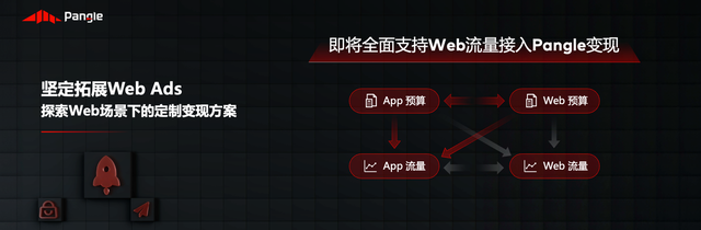 为帮助出海开发者开拓更丰富的商业化场景,Pangle在2023年将全面开拓Web流量。从整个海外广告收入大盘可以看到,相比于App流量,Web广告收入是App广告的5.5倍,且Web流量可更好地适配落地页转化场景,拥有更广阔的收入空间。打通Web流量不仅可帮助同时拥有App流量和Web流量的开发者更好地变现,也可让广告主买到更多优质流量。同时,Pangle还可利用Web流量的人群画像、流量适配、流量质量等数据,进一步反哺App流量增长。截至目前,Pangle已完成Web流量产品侧的开发工作并在进行各项测试中,预计将于明年正式打通Web和App生态。