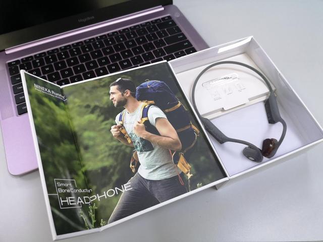 和其他耳机包装不同的是南卡骨传导耳机采用的是侧翻盖的形式,打开之后左侧整体是一个使用场景的图片,非常的直观,让你能够感受到这款产品在使用时的情景。右侧则是产品和它的配件。