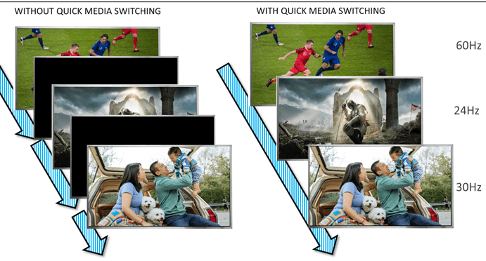 QMS快速媒体切换功能可以瞬间切换显示内容的分辨率或刷新率,而不会有任何显示中断,换句话来说就是解决了我们在切换不同信号源令人讨厌的黑屏等待的问题,实现快速的节目源切换。这个也是HDMI2.1标准中最为实用的功能之一。