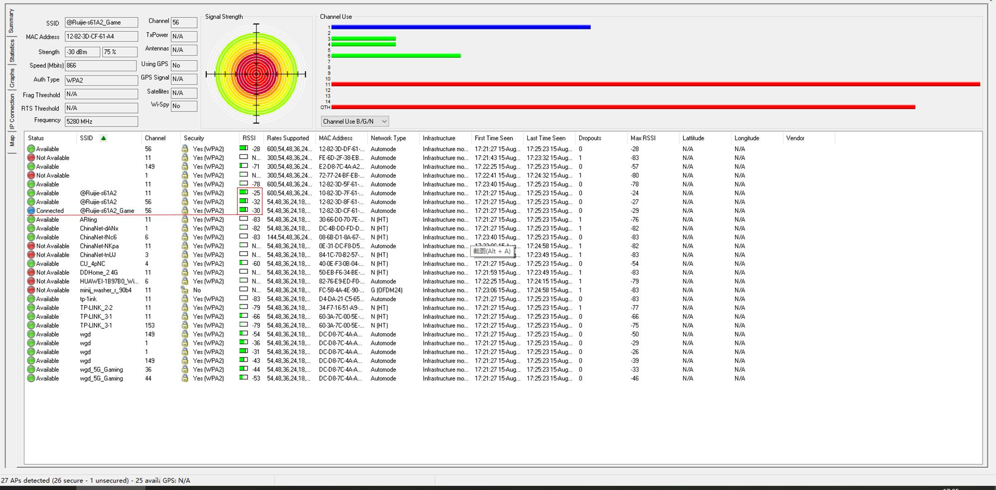 在信号1点,距离路由器没有任何隔墙,距离大约1.5m,笔记本连接的是Game频段,可以看出Game频段的信号强度为-30,5G频段的信号强度是-32,2.4G频段的信号强度是-25.