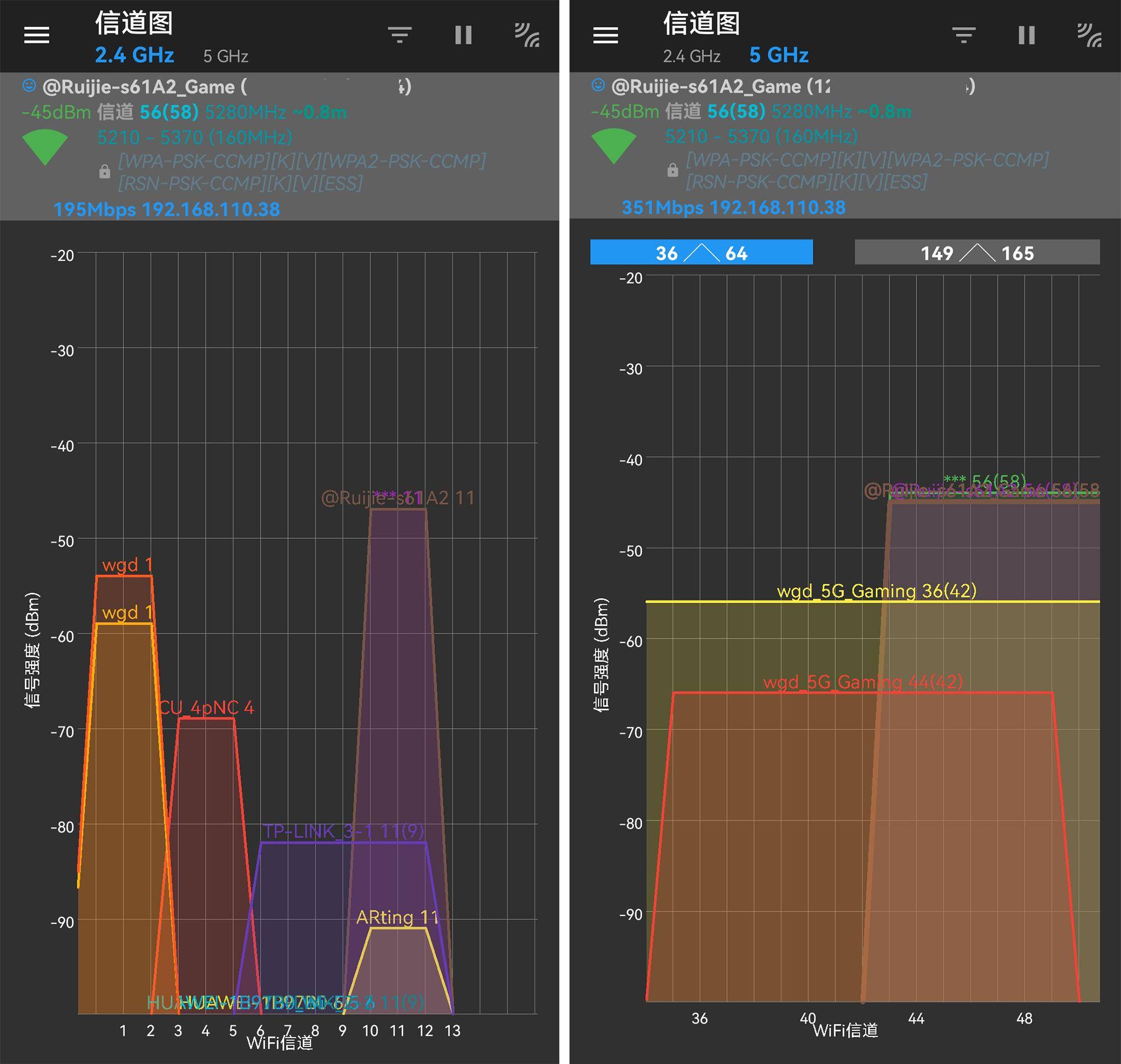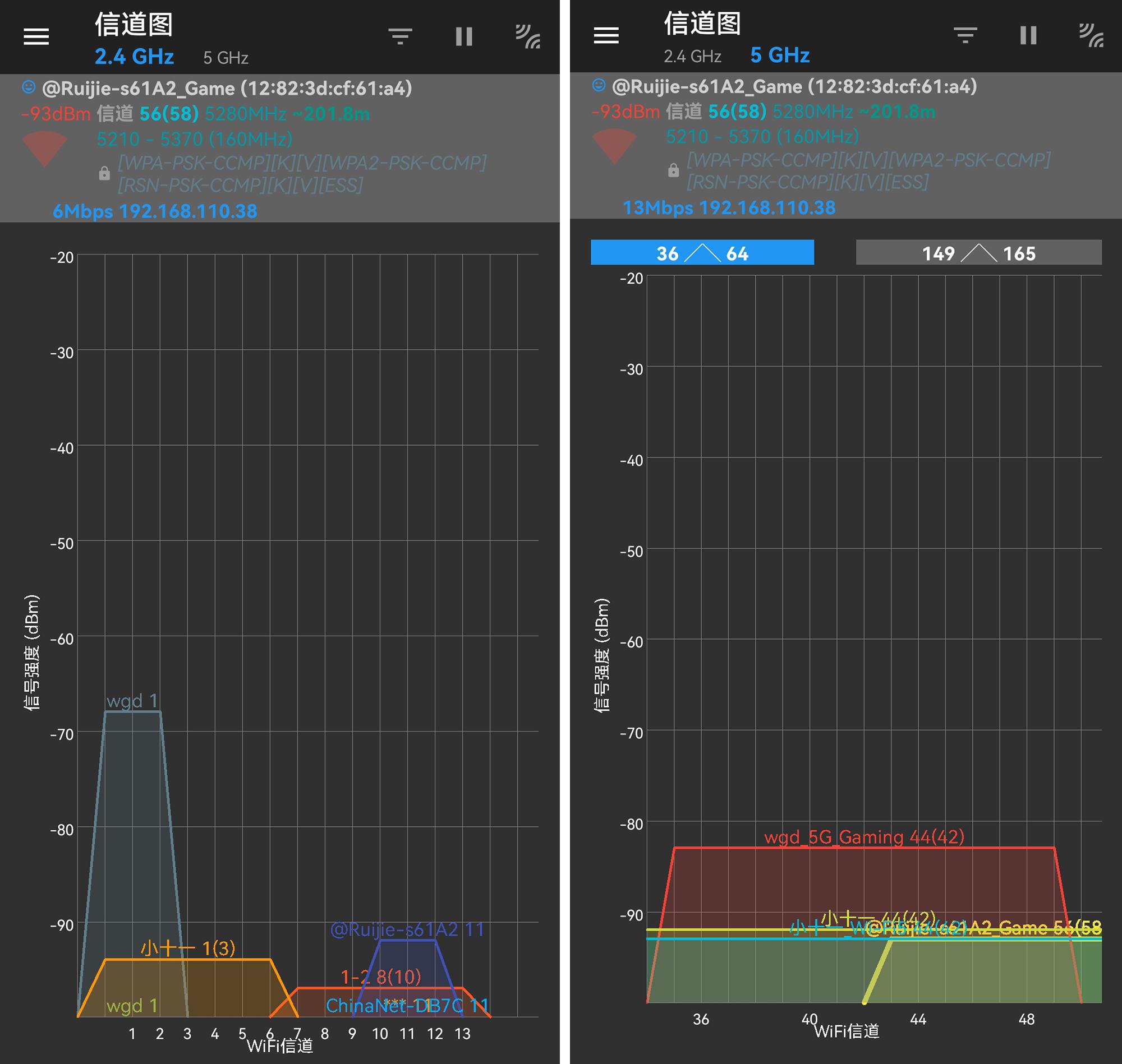 除了笔记本,手机、平板已经是主流的无线设备了。所以也是用华为荣耀20pro进行了Wi-Fi信号强度测试。不隔墙的基本没什么悬念,所以是从测试点2开始进行测试的。作为对比的是某无线宝,在测试点2时,不管是2.4G频段还是5G频段锐捷天蝎的Wi-Fi信号强度都明显要好一些。