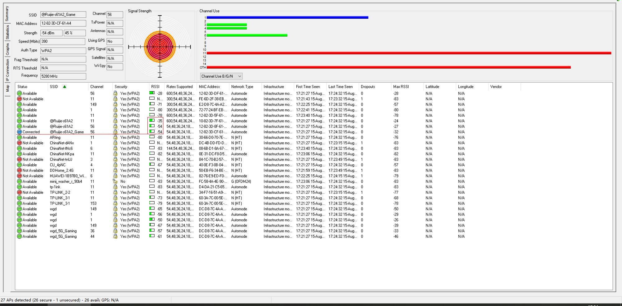 在信号点4,距离路由器有房间门以及24cm的承重墙,距离路由器大约有7m距离,,笔记本连接的是Game频段,可以看出Game频段的信号强度为-54,5G频段的信号强度是-54,2.4G频段的信号强度是-35.
