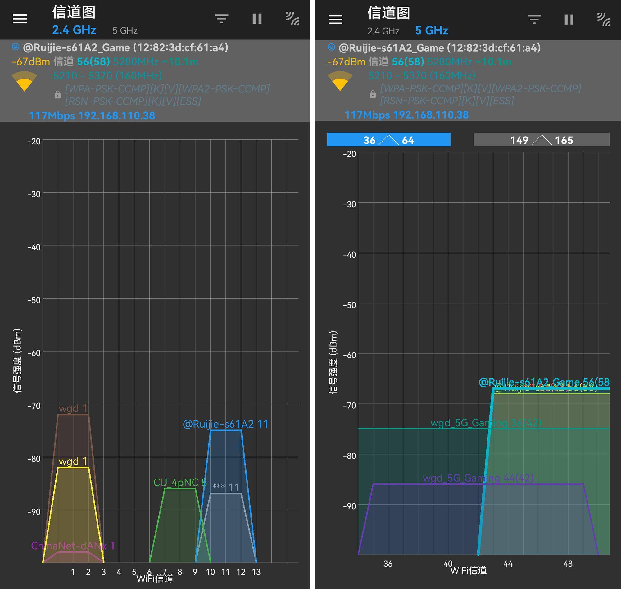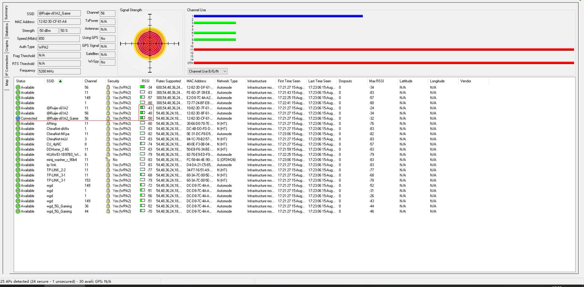 在信号点2,距离路由器有一堵12cm厚的非承重墙,距离路由器大约有3m距离,,笔记本连接的是Game频段,可以看出Game频段的信号强度为-50,5G频段的信号强度是-48,2.4G频段的信号强度是-43.