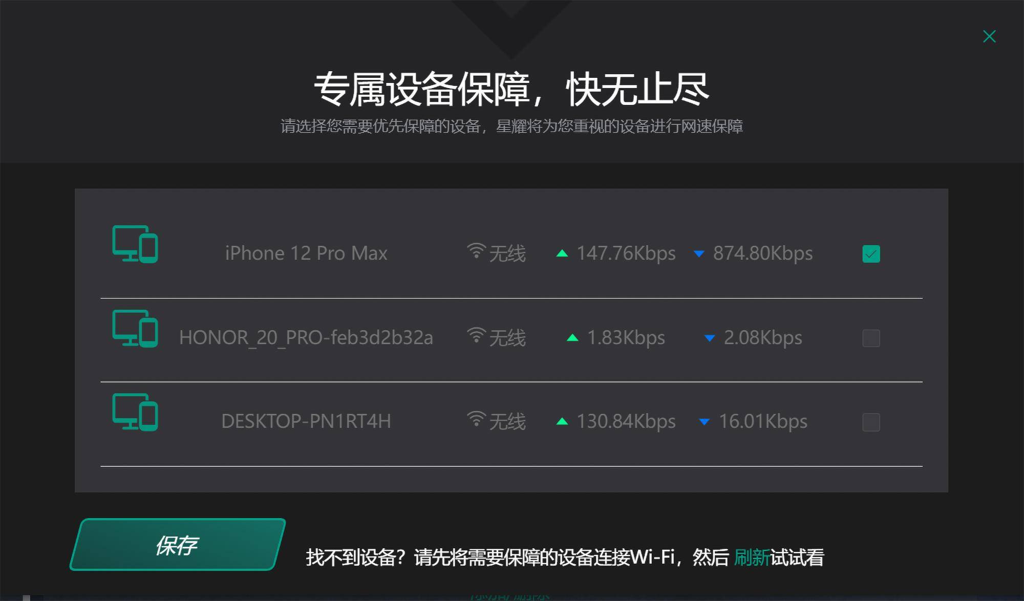 要说日常价家用路由器最怕的就是一大家子人共用同一个网络,家长或者孩子在看电视,而准备打游戏的你就要忍受网络高延迟。锐捷天蝎可以通过设置专属设备保障来实现游戏、会议优先网络保障,将手机、笔记本、电脑等设置为专属设备后,不管其他设备怎么占用网络,也不影响专属设备的正常使用。