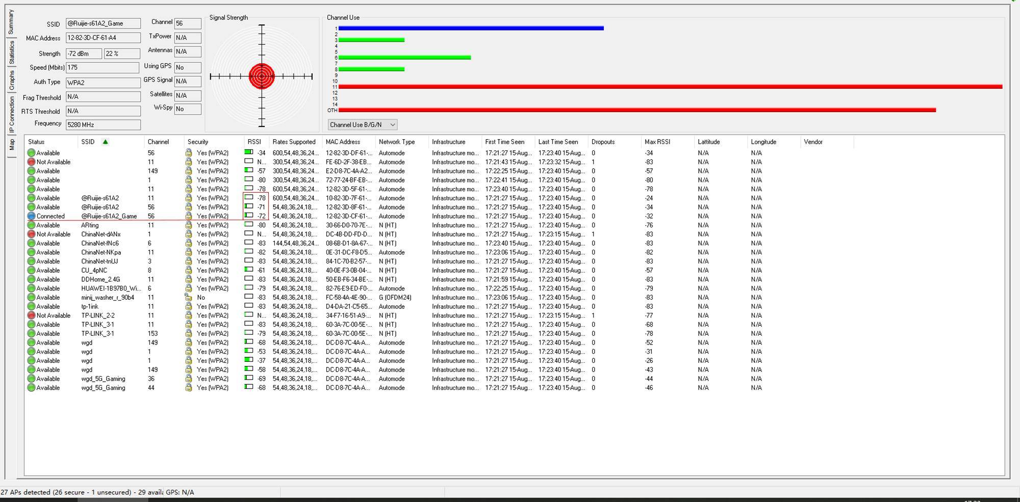 在信号点3,和路由器之间的情况比价复杂,距离路由器大约有6m距离,笔记本连接的是Game频段,可以看出Game频段的信号强度为-72,5G频段的信号强度是-712.4G频段的信号强度是-78.
