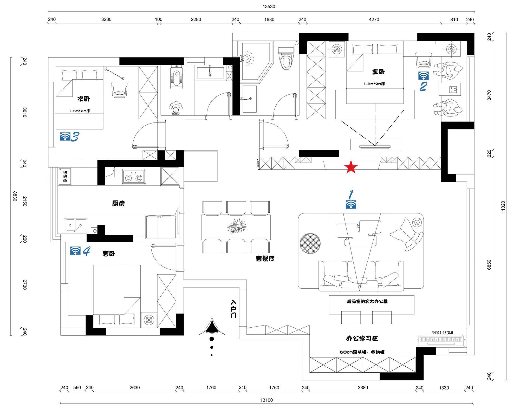 Wi-Fi信号是一款路由器的基础指标,不管宣传中使用了多么“牛逼”的硬件,信号不行也是白给。本次在一户120平左右的平层对锐捷天蝎的Wi-Fi信号进行的测评,分别使用了笔记本和安卓手机进行了信号强度测试,锐捷天蝎放在红色五角星处,然后分别在1、2、3、4四个距离路由器不同的距离、不同的隔墙环境进行测评。