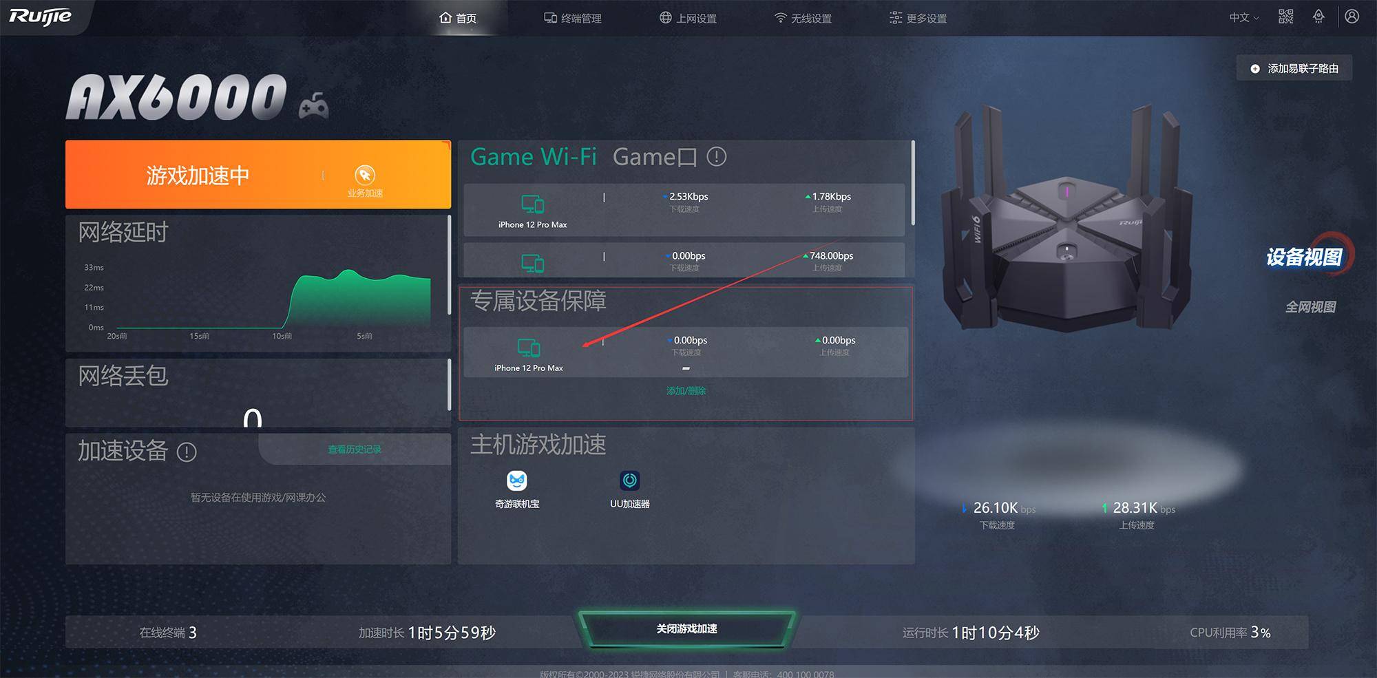 办公与游戏少一不可。如果说锐捷天蝎的专属设备能够保证4台设备的网络,那么它对于游戏的加速功能则可以保证游戏的流畅性。顺手开一把王者,可以实时的在锐捷天蝎的管理端看到游戏中的设备处于加速状态。