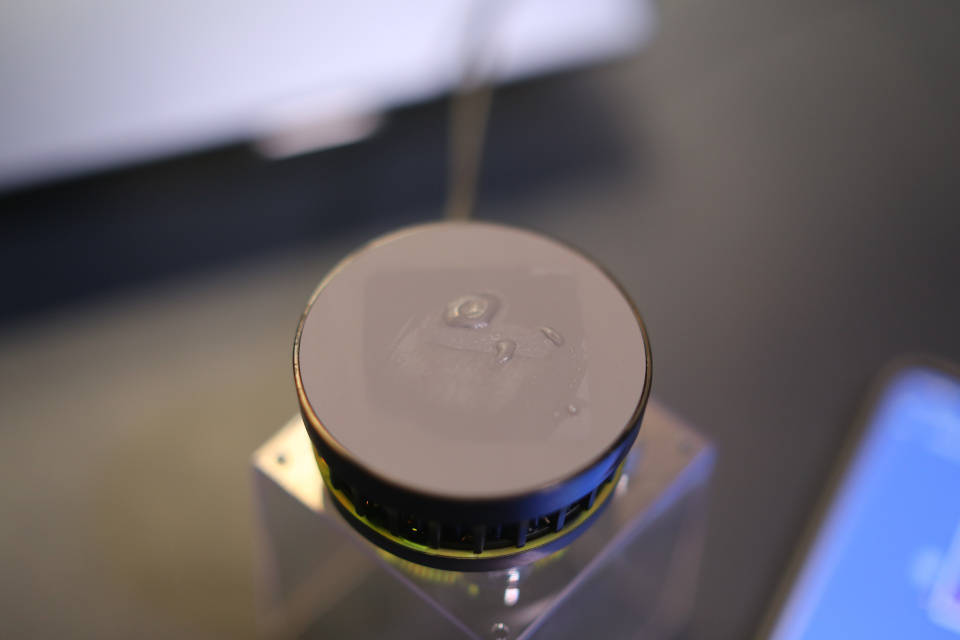 接下来我们来进行水的结冰测试,测试的环境温度是24度,而散热器开机使用最大功率散热,加水跑15分钟之后,可以发现水结冰了,而且扣冰的时候还把硅胶给扣出来了(上面的动态图可以看到被扣掉的位置),所以用水来做结冰测试,不要在结冰的时候去扣冰,最好就是关机后用温热的东西让冰融化,不要直接扣,不然就跟我那样扣了一块出来。所以北通ICE手机散热器还能给饮料降温,夏天在办公室也能喝到冰饮。