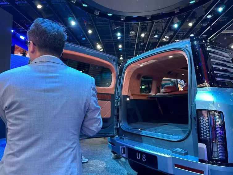 作为仰望精心打造的首款车型,仰望U8是一款集极致安全、性能和体验于一身的跨时代产品。仰望U8定位为中大型SUV,采用了硬派的设计风格。车头采用了点阵式排列的格栅样式,前后均配备点阵式光源,具有极高的辨识度。车顶探测系统位于前挡风玻璃上方,除了激光雷达,还内置了智能科技硬件,能够提供更强的环境探测能力。在成都车展期间,豪华版仰望U8座舱首次向公众开放,用户可以近距离欣赏其豪华内饰并体验智能座舱。该车型也吸引了大批观众前来观赏。