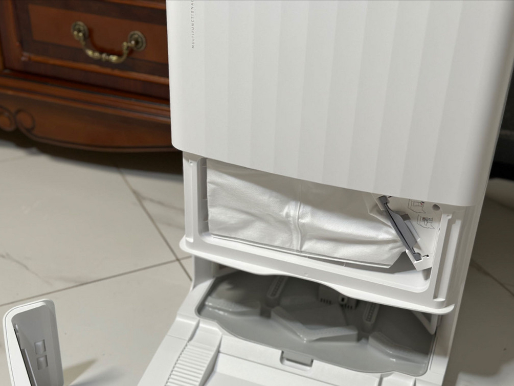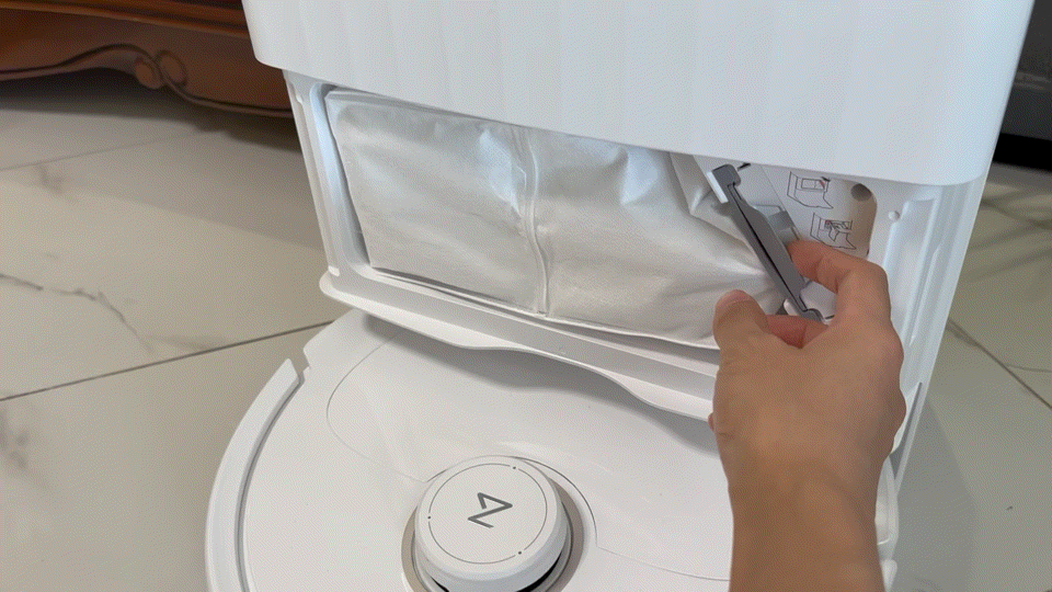 水箱下面便是集尘袋的位置,机器人每次清洁结束后便会主动回收尘盒中的垃圾,65天更换一次尘袋简直就是懒人的福音。过敏人士和有孩子的家庭可以选择超强集尘模式,虽然噪音大时间长,但是可以更高效的将灰尘收集到抗菌尘袋中。