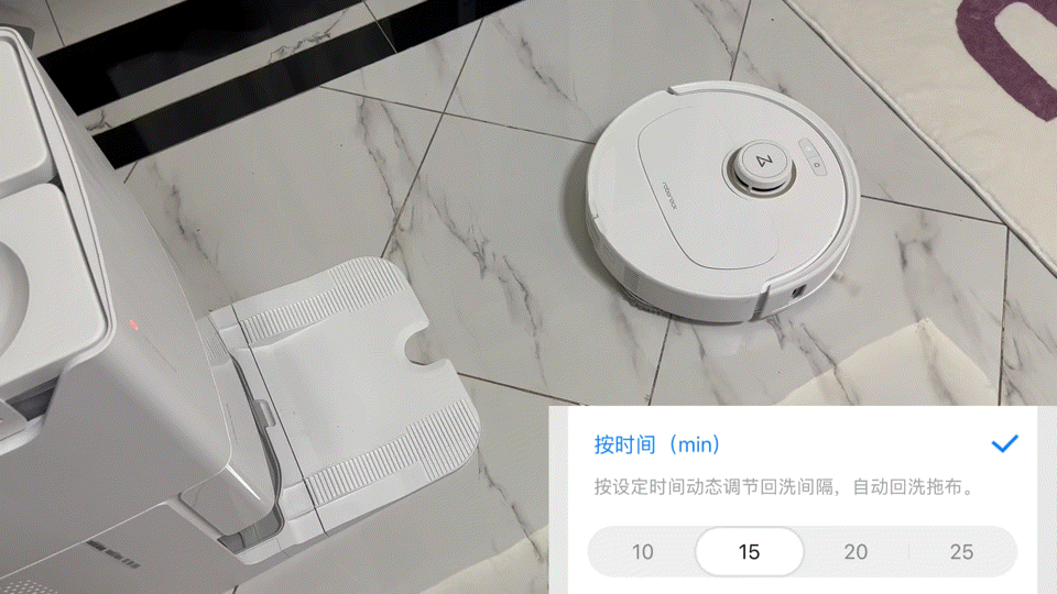 在拖地过程中,石头P10 Pro还会不断的返回基站清洗拖布,确保拖布的干净程度,回洗拖布的频率是可以在APP中调节的,不仅可以调节回洗时间,还可以根据家里的地面对拖布的湿度进行调节。